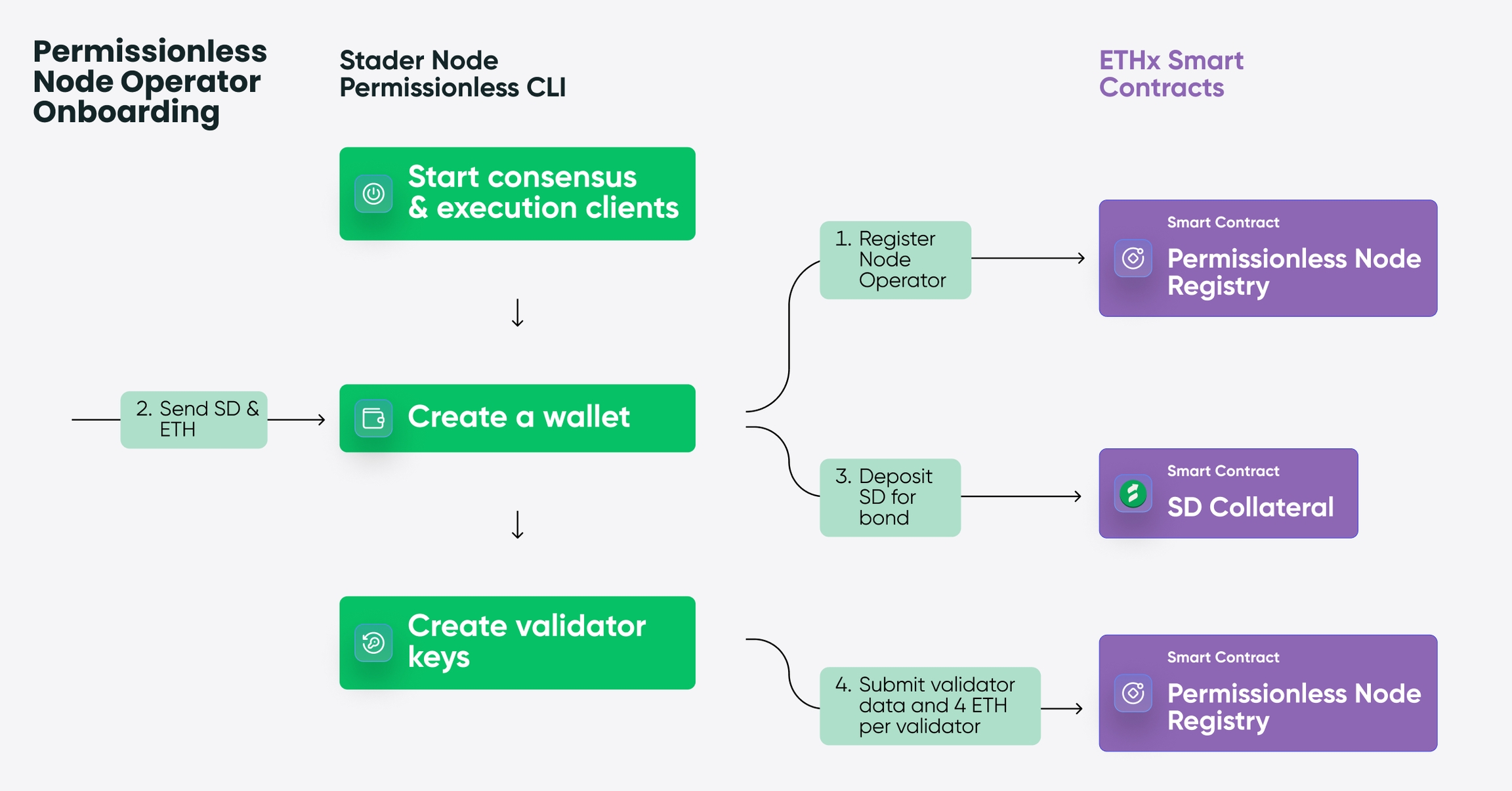 Permissionless node operator: Deposit 4 ETH and 0.4 ETH worth of Stader governance token (SD) as a security bond for each validator and run one or more validator clients. Qualifying for this criterion enables the node operator to join ETHx’s permissionless pool.