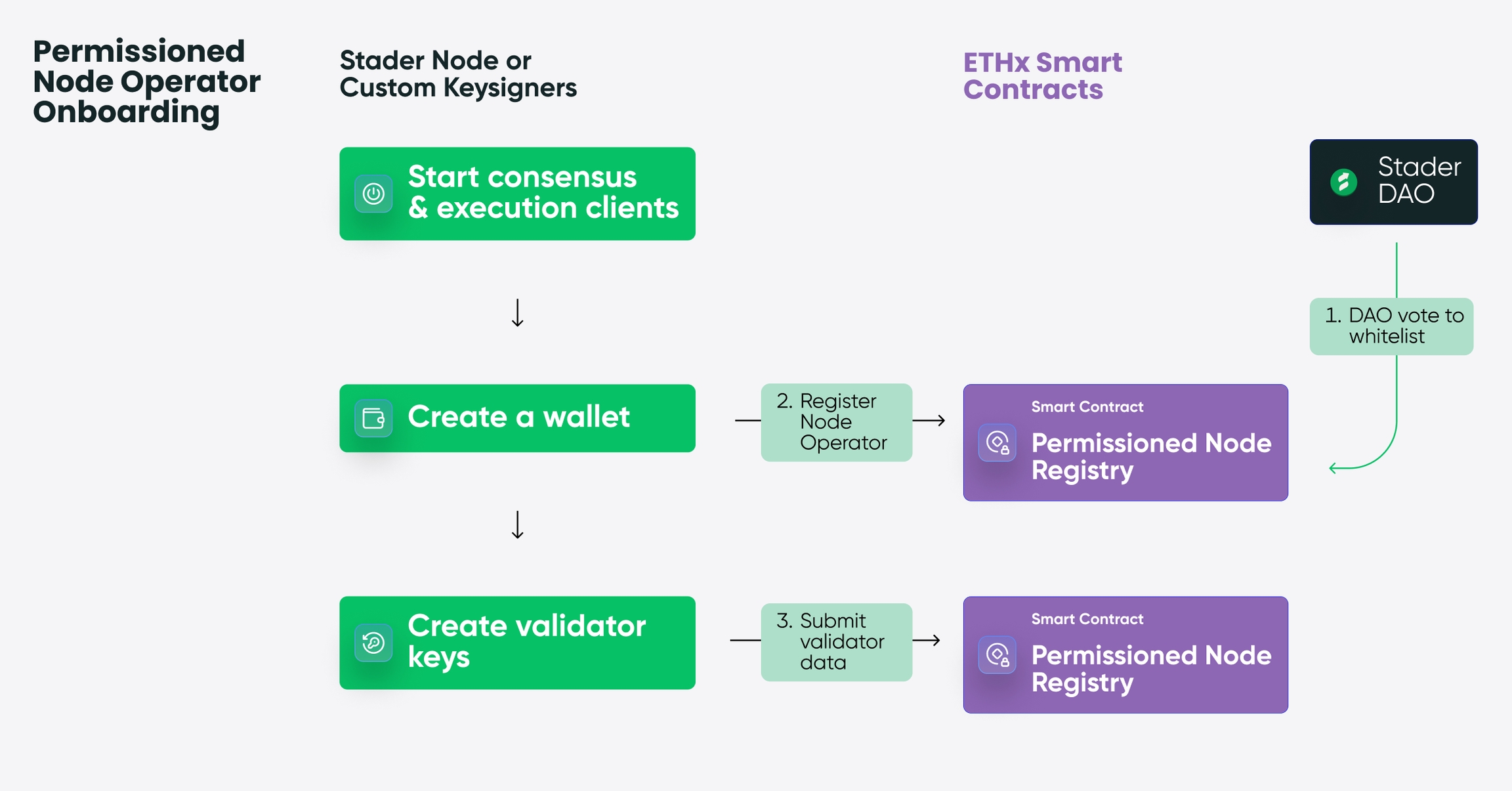 Stader ETHx is built to reduce technical and capital barriers to running nodes on Ethereum and empowering smaller node operators is of the highest importance for Stader. Stader’s ETHx permissionless pool lets anyone operate a node with 4.4 ETH of asset collateral [4 ETH + 0.4ETH worth of SD (Stader’s governance token)]. To remain scalable and have the backup capacity, the permissioned pool will onboard a few select operators with a history of running nodes at no collateral. Depending on eligibility, a node operator can be onboarded to the permissionless or permissioned pool.