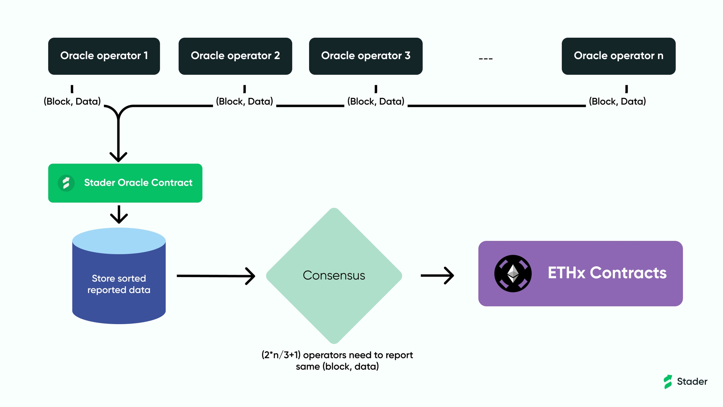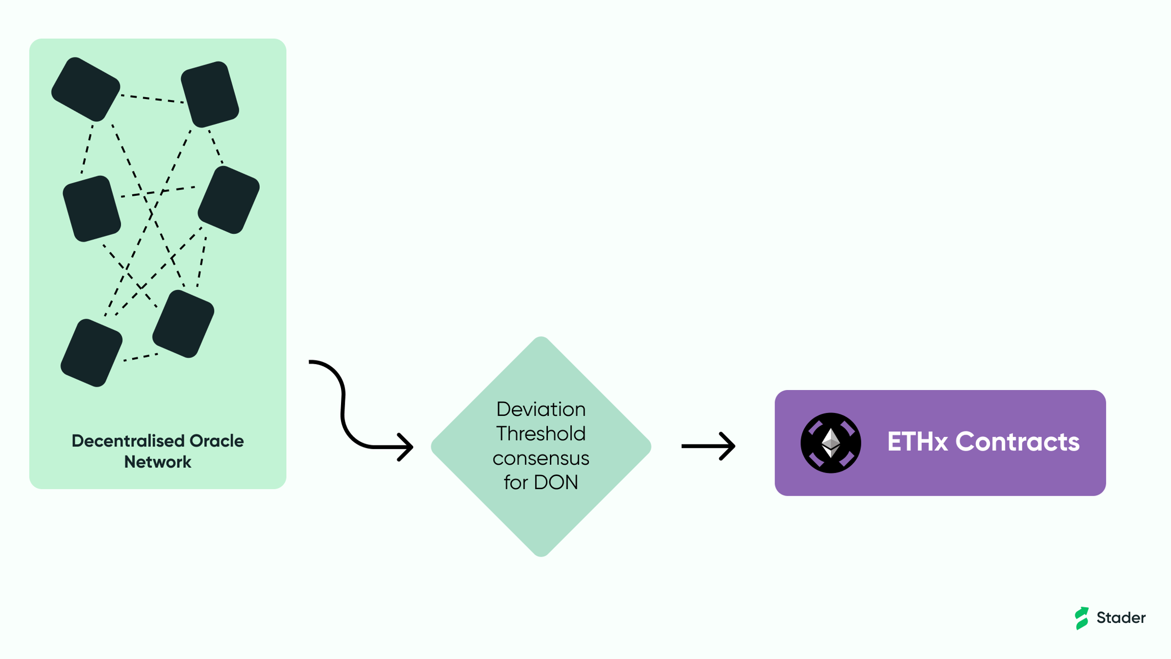 Exchange rate The exchange rate of ETHx to ETH determines the conversion when users stake ETH to mint ETHx or burn ETHx to withdraw ETH. Computing the exchange rate requires the following three conditions: a. Amount of ETHx tokens in circulation b. Amount of ETH tokens that are staked or in the process of being staked. c. Ensuring that the above two conditions are reported for the same block number. The exchange rate of ETHx to ETH is defined as the total ETHx supply divided by the total ETH that is staked + in the process of being staked at any point. Stader Oracle contract sets the frequency of updating the exchange rate data. The Oracle client operators report the exchange rate through the majority consensus mechanism for appropriate blocks. Between Oracle consensus updates, the exchange rate is constant and assumed to be non-changing. An exchange rate update that meets the consensus threshold is accepted if it’s within a specific range of the old exchange rate. Inspection mode is enabled when the new exchange rate deviates significantly from the old one. In inspection mode, the Stader manager is expected to verify the validity of the new exchange rate. Anyone can also turn off the inspection mode after the verification period for the inspection mode ends. The latter ensures that anyone can continue exchange rate updates except during short bursts for verification purposes. Stader has partnered with Chainlink to provide Proof of Reserve data feeds for both ETHx and ETH supply to act as an alternative to the above. In the subsequent protocol upgrades, we expect to integrate and transition to Chainlink’s Decentralized Oracle Network (DON).